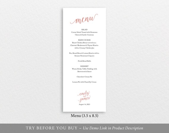 Wedding Menu Template 3 5x8 5 Try Before You Buy 100 Editable Instant Download Rose Gold Script