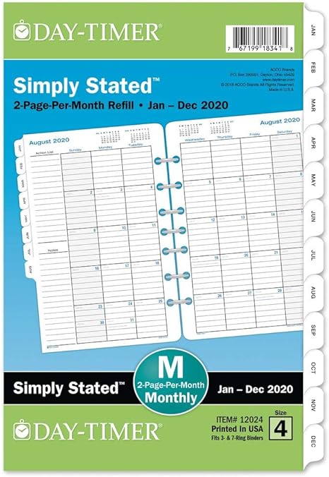 Day Timer 2020 Monthly Planner Refill 5 1 2 X 8 1 2 Desk Size 4 Two Pages Per Month Loose Leaf Simply Stated 12024