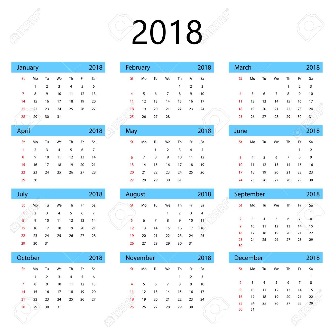 Calendar 2018 Year Week Starts Sunday Us Vector Clear Or