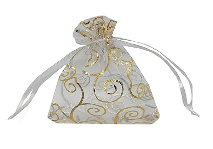 Ankirol 100pcs Sheer Organza Favor Bags For Wedding Baby Shower Rattan Print Gift Bags Samples Display Drawstring Pouches 4x6 White