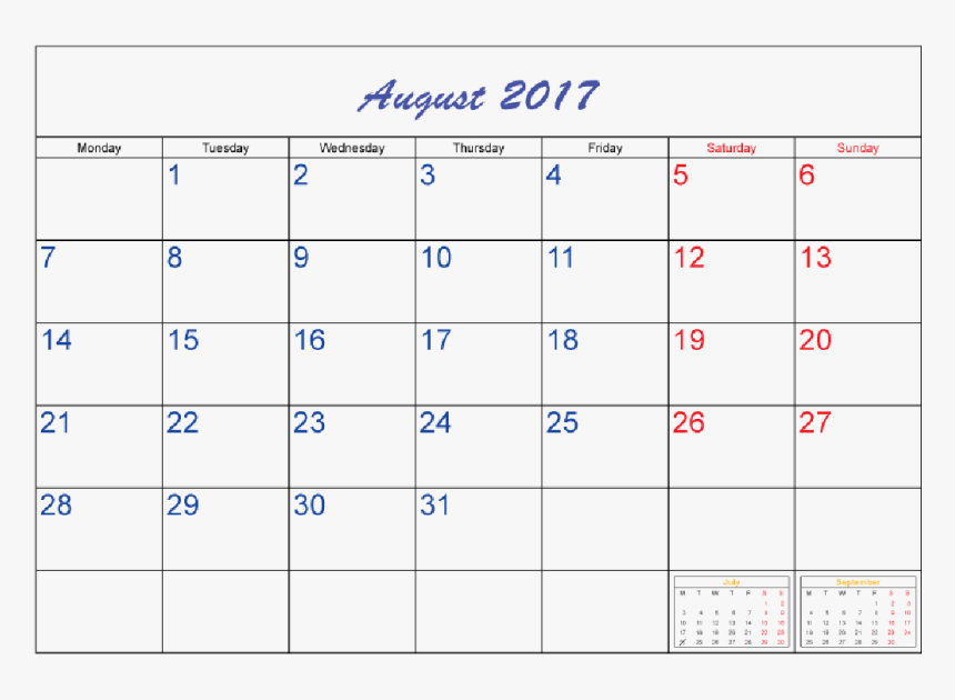 Printable August 2017 Calendar Template Images Transparent