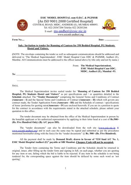 Tender For Running Of Canteen For 350 Bedded Employees