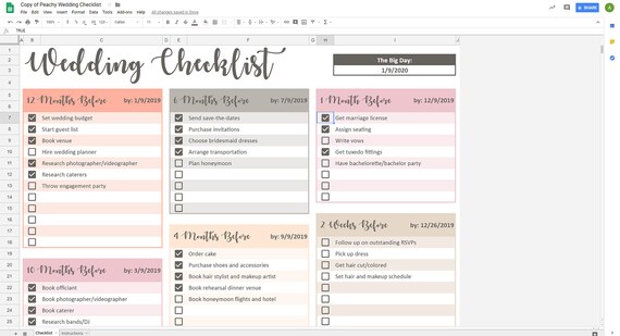 Peachy Wedding Checklist Google Sheets Template Editable Checkable Printable Wedding Timeline To Do List Instant Digital Download