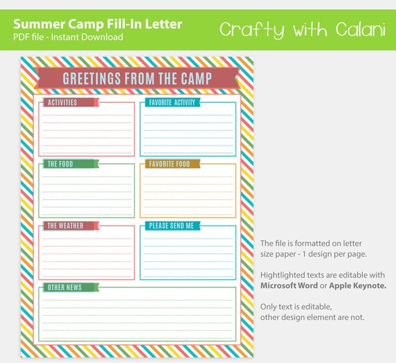 Camp Stationery Summer Camp Letter Template Summer Camp Stationery Printable Kids Summer Camp Fill In Camp Letter Camp Letter Printable