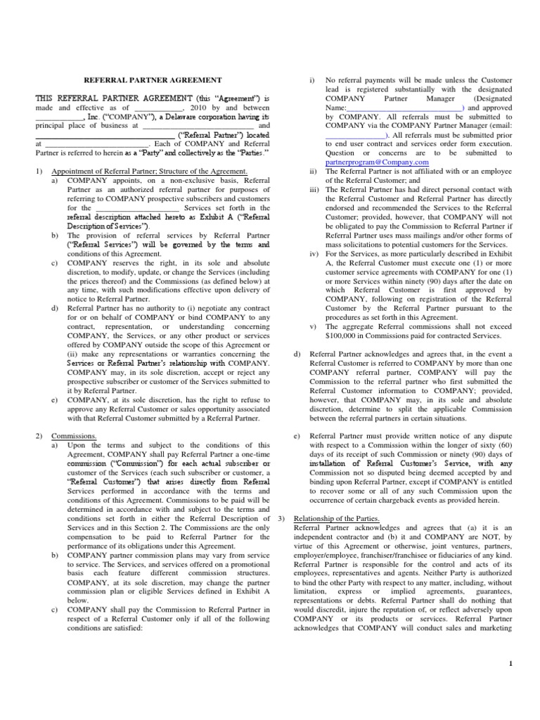 A referral agreement will formalize the terms and conditions of the contract whereby an independent agent will promote the goods or services of a company for a referral fee. It would contain all the expectations and rights of the employee and employer.