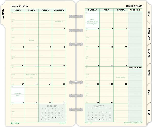 Day Timer 2 Page Per Month Tabbed Calendar Refill Portable Size