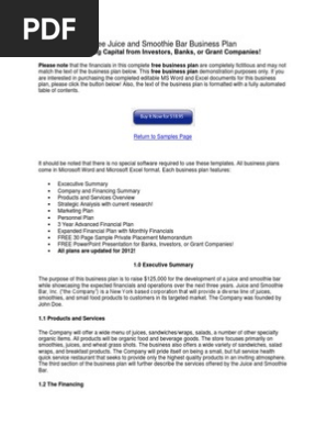 Investors love doing business with people are. When compiling together a business plan for smoothie and juice bar it is important that you highlight these opportunities and give precise details on how you are going to capitalize on them. Pdf sample and template are available.