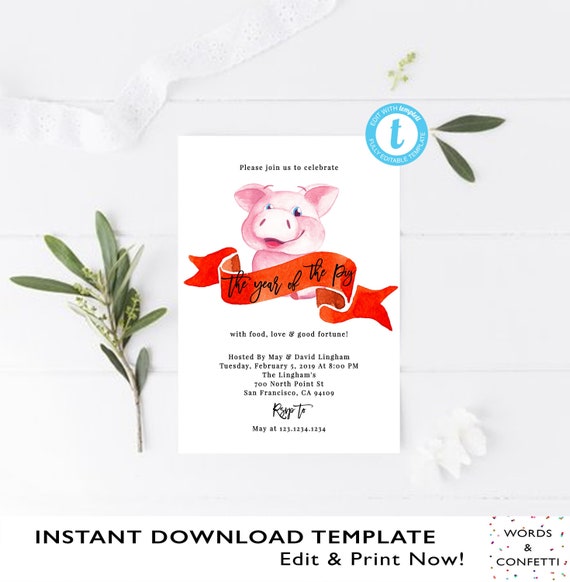 Chinese New Year Invitation Chinese New Year Party Chinese Invitation Cards Chinese New Year Pig Card The Year Of The Pig Chinese Party