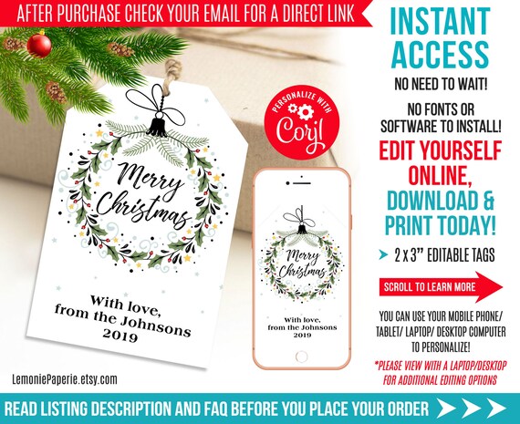 Merry Christmas Tags Christmas Wreath Tags Template Editable Christmas Gift Tag Printable Christmas Tags Edit Yourself Instant Download