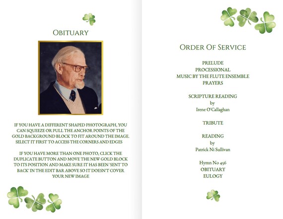 Irish Catholic Funeral Mass Program Template Shamrocks Celtic Knot Gold Photo Frame Folding Printable Committal Memorial Service